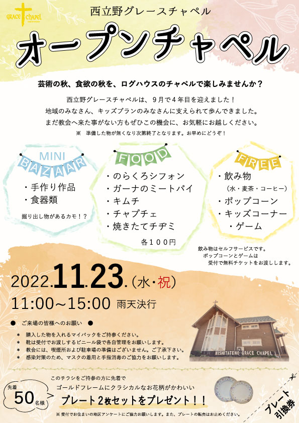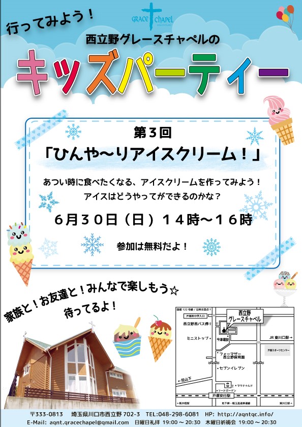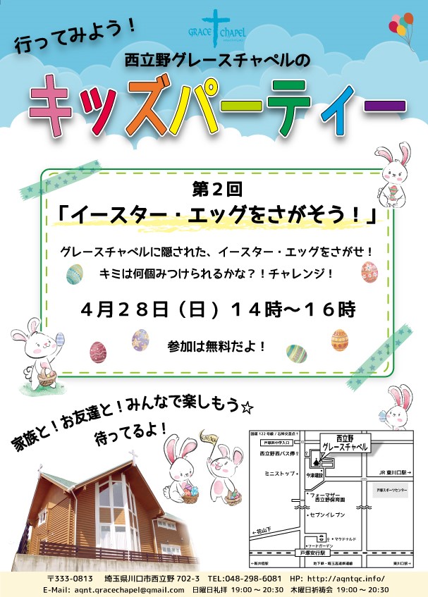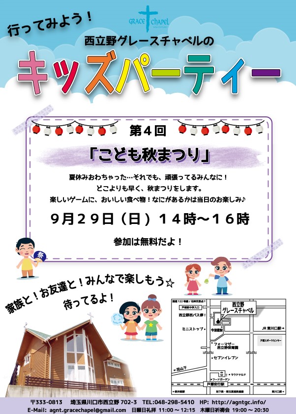 川口市西立野にあるログハウスの教会です。地域のコミュニティの基点として、「ほっ」とできるオアシスの様な教会を目指します。